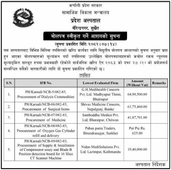 * बोलपत्र स्वीकृत गर्ने आशयको सूचना ।